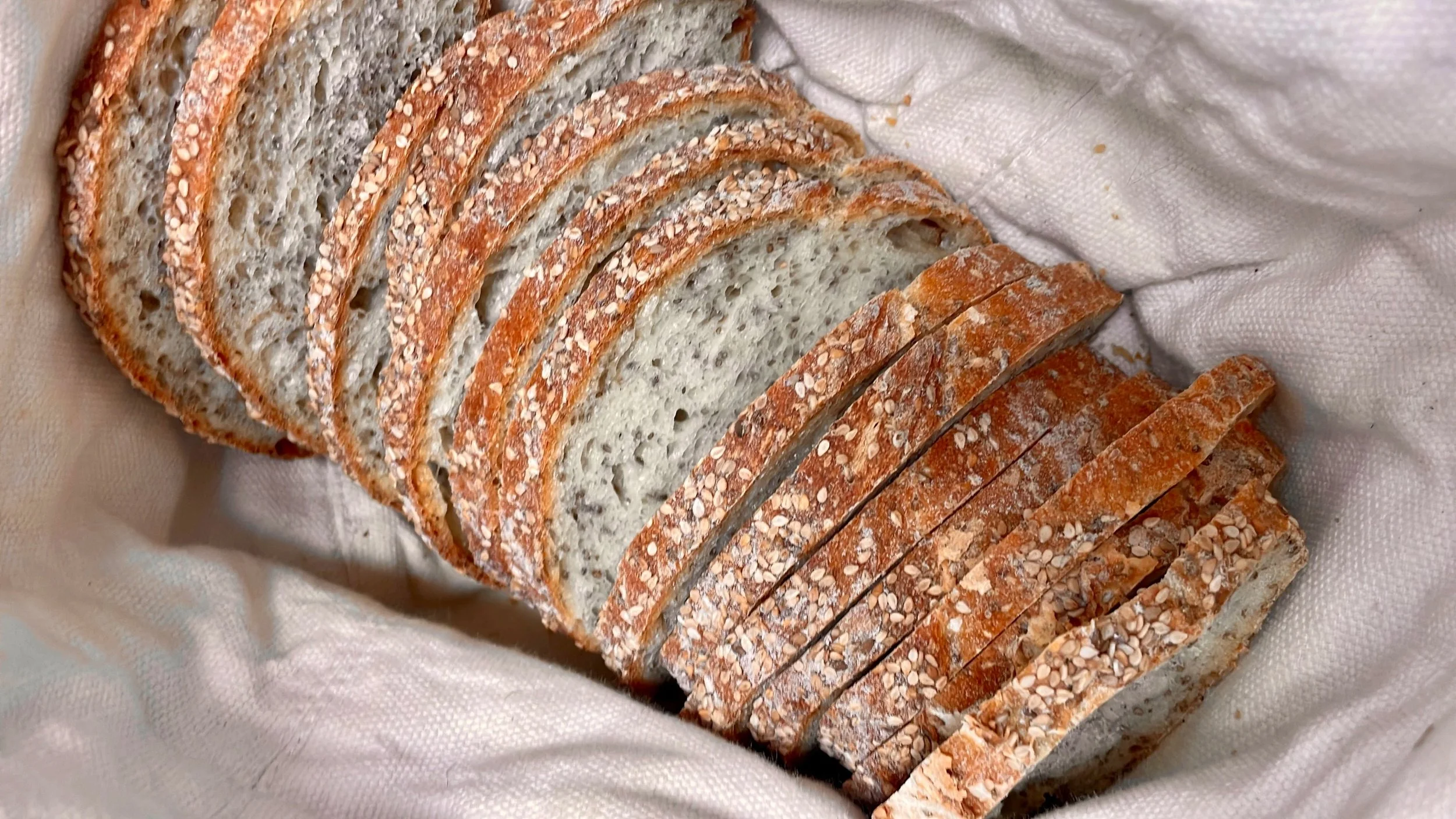 Teig in Sesam wälzen und zu Brot formen, z.B. gezwirltes Baguette (immer wieder gegensätzlich verdrehen),