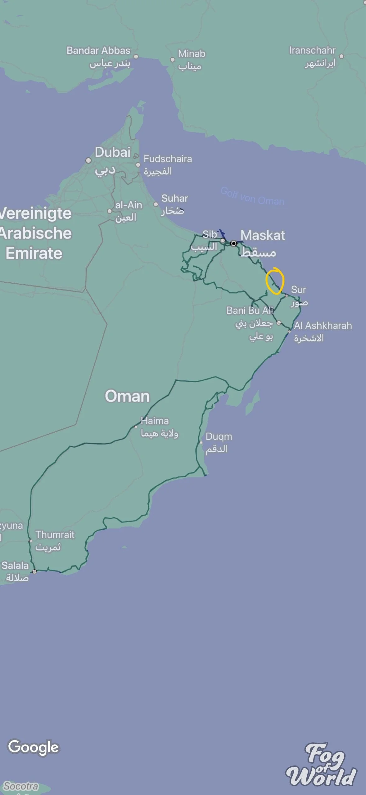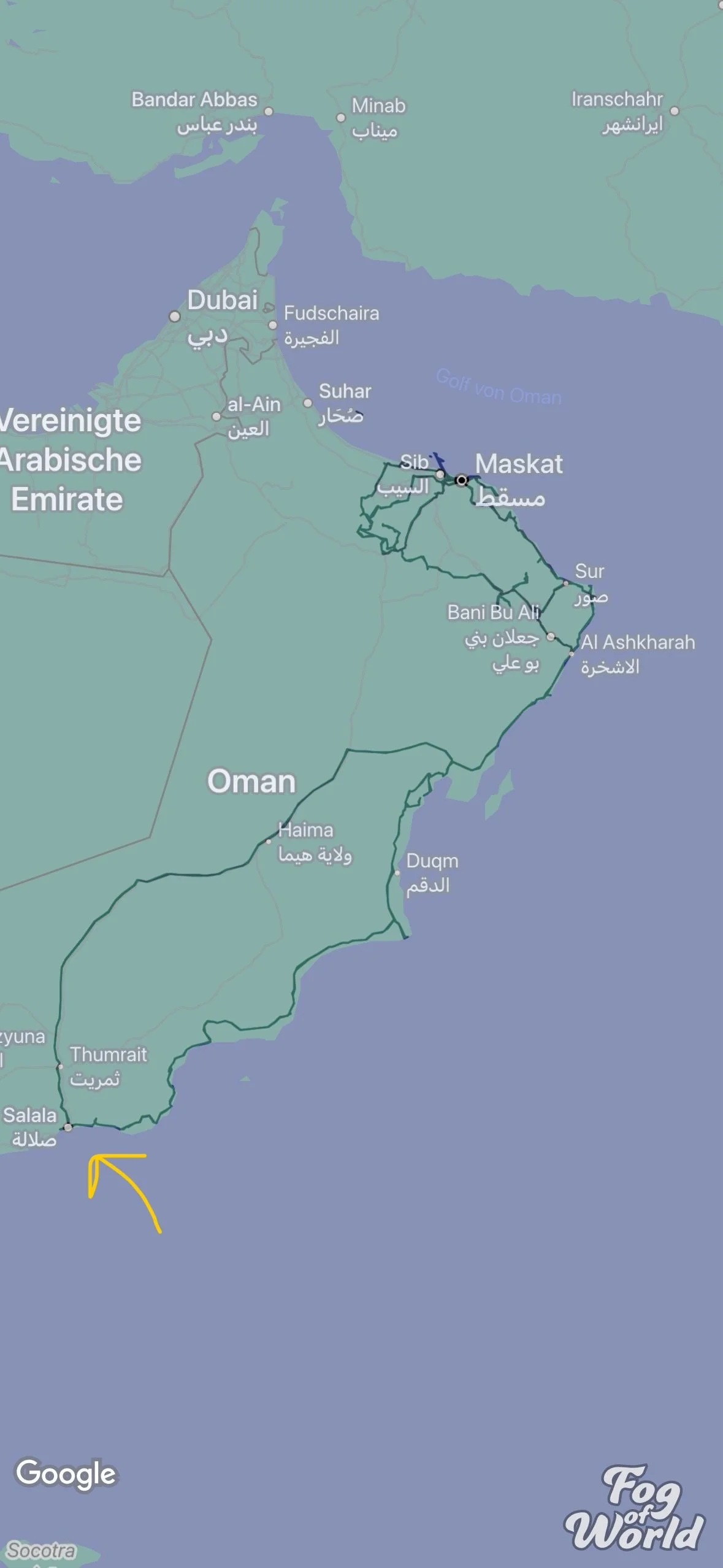 Es gibt mehrere Möglichkeiten nach Salalah zu fahren: Schnellstraße von Nizwa aus über Hayma, eine befestigte Straße von Sinaw Richtung Küste, die gestrichelte Linie durch Wahiba Sands - eigentlich keine wirkliche Option, denn die darf man nur im Konvoi fahren, alles andere ist Lebensmüde - und die Küstenstraße, bedeutend länger und weiter. Nach unserer schrecklichen Nacht im Zelt fahren wir völlig gerädert an der Küste bis kurz vor den White Sugar Dunes, auf die ich im Moment überhaupt keine Lust habe, und entschieden uns ab hier für die Schnellstraße über Hayma. 6 Stunden später sind wir in Salalah. So gehts eigentlich.