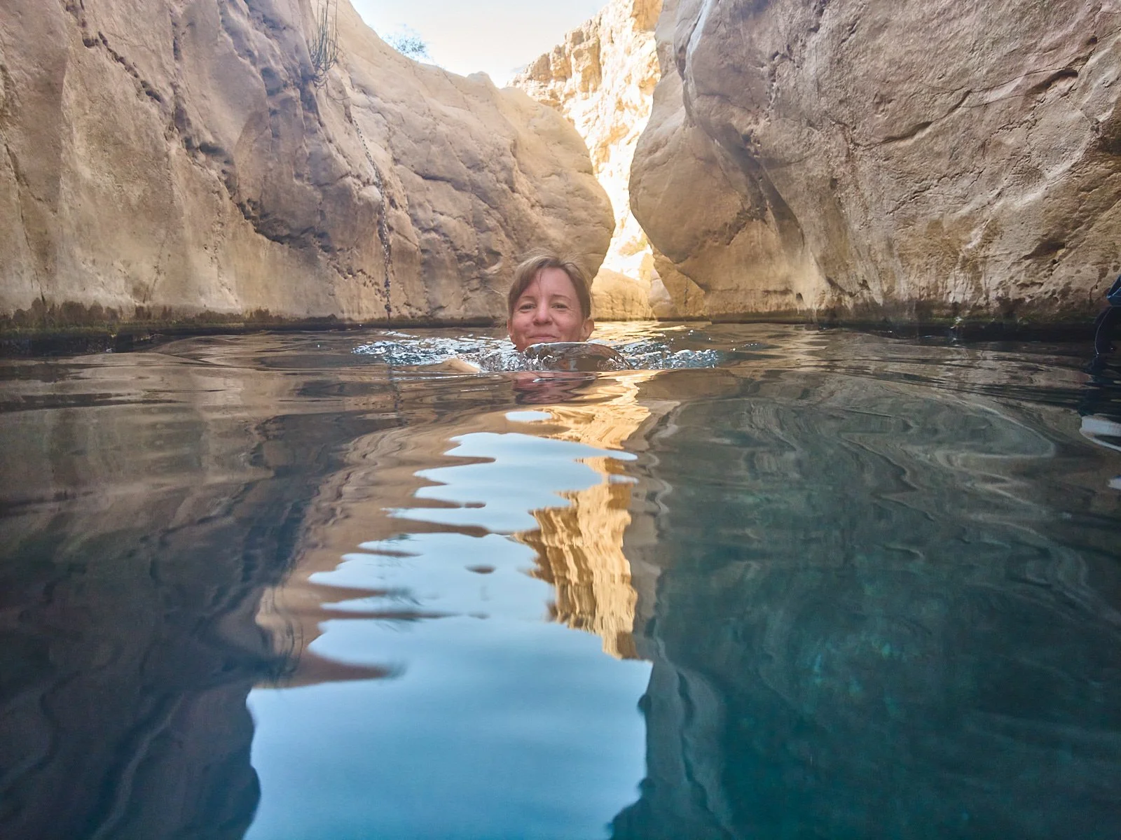Das Wasser ist warm! Es kommt aus heißen quellen, kühlt im Fels nicht ab und gleicht Badewannentemperatur. Herrlich! Wir packen alles in unseren Wasserrucksack und schwimmen bis vorne hin. Wickeln uns dort in Handtücher und verlassen pünktlich um 11 das Wadi, das wieder von Touristenmassen überrannt wird.
