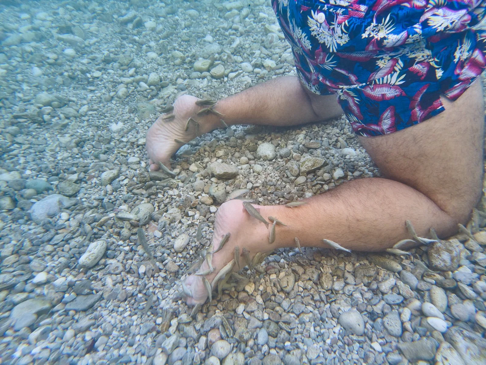 Wir haben für alles so lange gebraucht, dass jetzt auch die Touri-massen angekommen sind. In der Felsspalte entsteht also Durchlassverkehr und Stau. Zeit zu gehen. Wir schwimmen zurück.