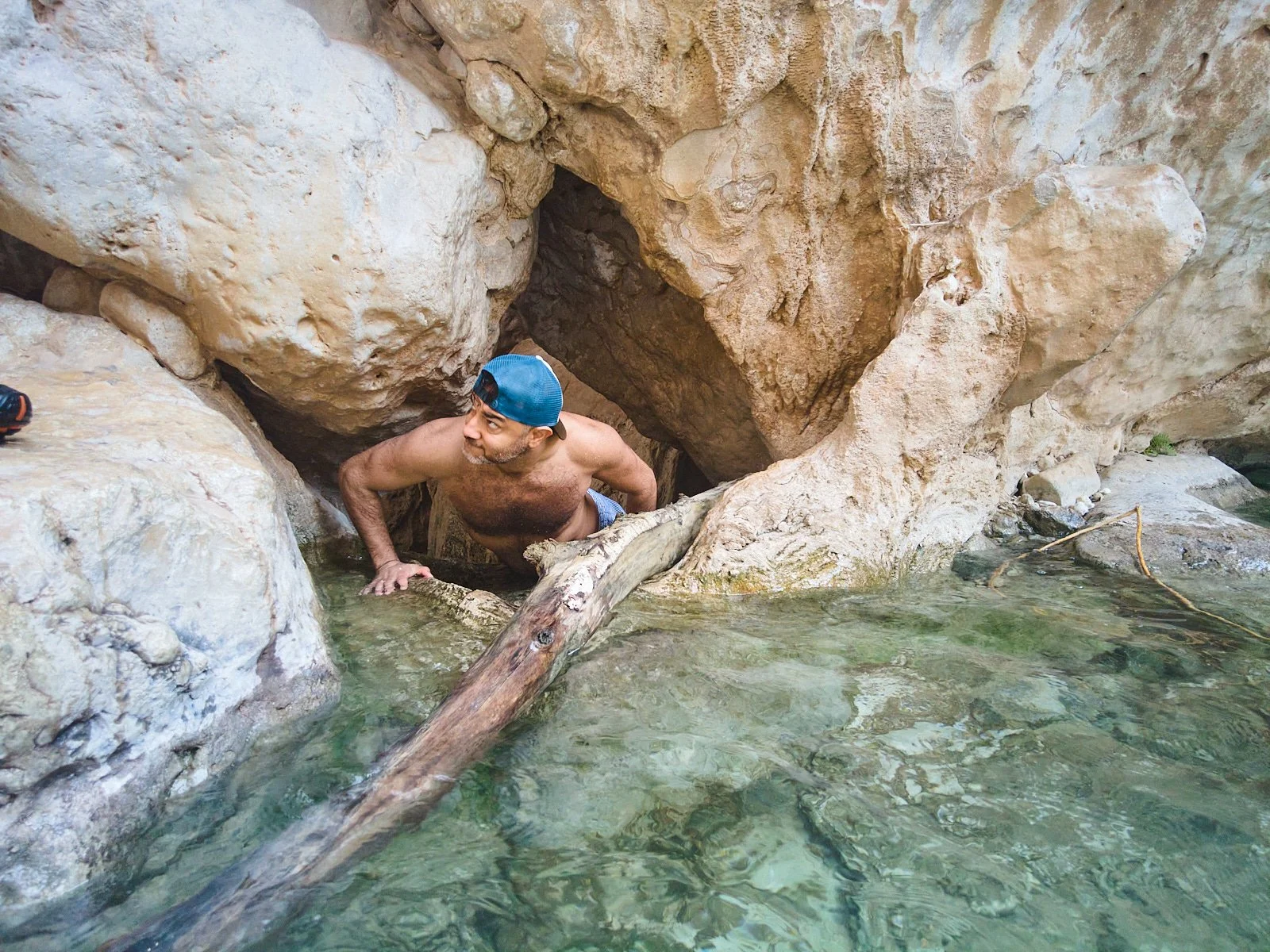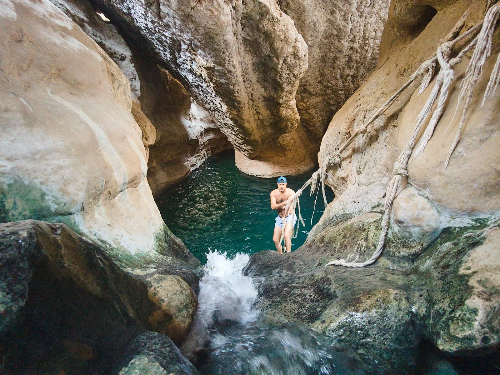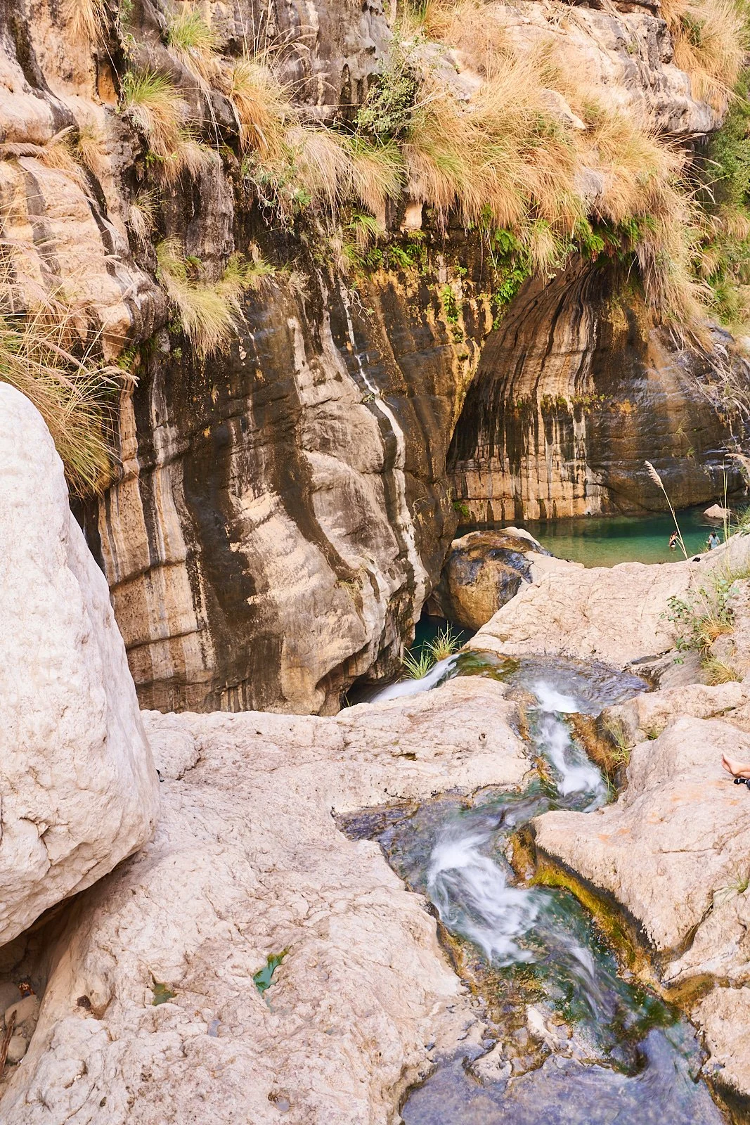 Das Wasser ist kalt, aber super sauber. Das Highlight ist eine Felsdurchqueerung bei der man sich tatsächlich mutig am Fels entlanghangeln muss, denn der Kopf passt gerade so durch, eine kleine Verengung am unteren Ende sorgt dafür, dass man hier den Hals strecken muss, denn für den Kopf ist das zu eng… Angekommen bzw. durchgekommen befindet man sich in einer kleinen Höhle in der ein Wasserfall hinunterrauscht - den man natürlich hochklettern kann! Oben angekommen gibt es weitere Pools, aber kein weiteres durchkommen. Ab jetzt gehts also wieder zurück.
