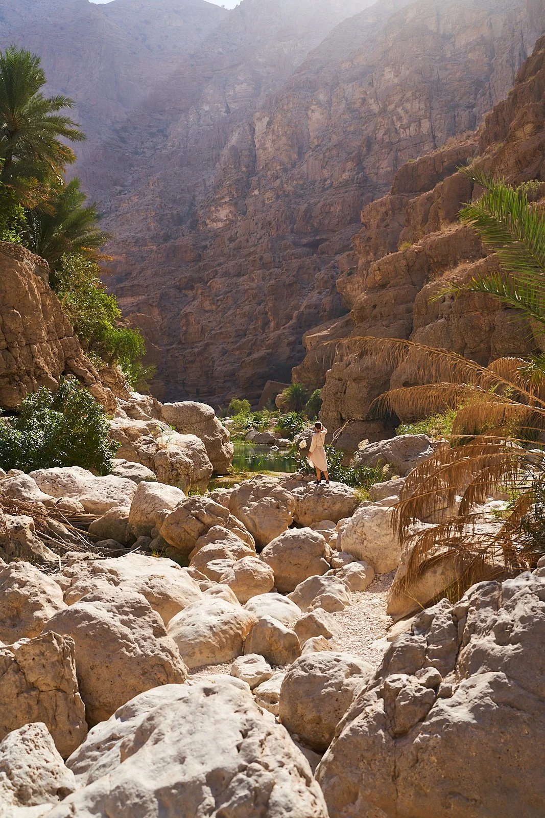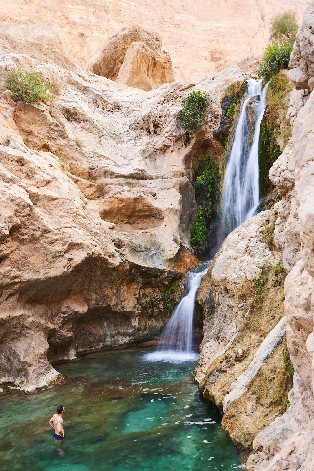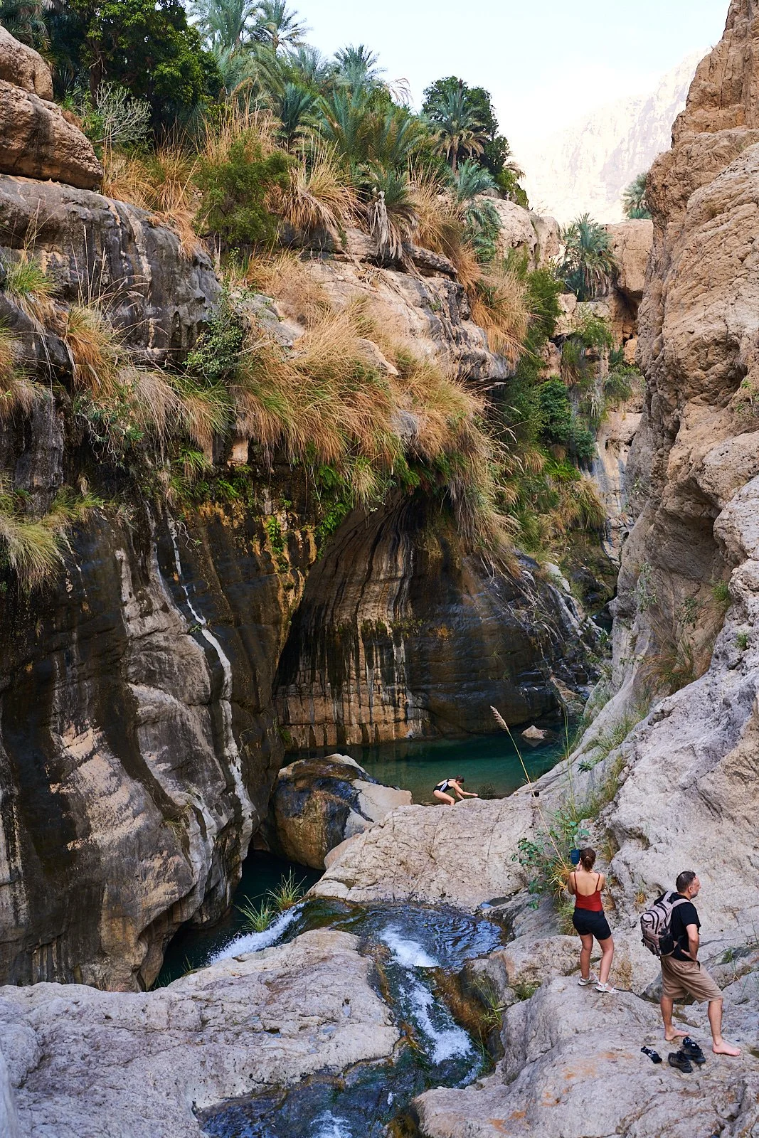 Meine Kamera bleibt übrigens nach dem Bild vom Wasserfall und dem Felsen gut verstaut im Rücksack - der auf dem Felsen bleibt. Wir klettern nur mit unserem kleinen Osmo Pocket in seiner Unterwasserhülle runter, bzw. werfe ich ihn Robert zu… In Oman hatte ich nie das Gefühl man könnte mich beklauen. Die Kamera war natürlich noch an Ort und Stelle als wir wieder hochkletterten.