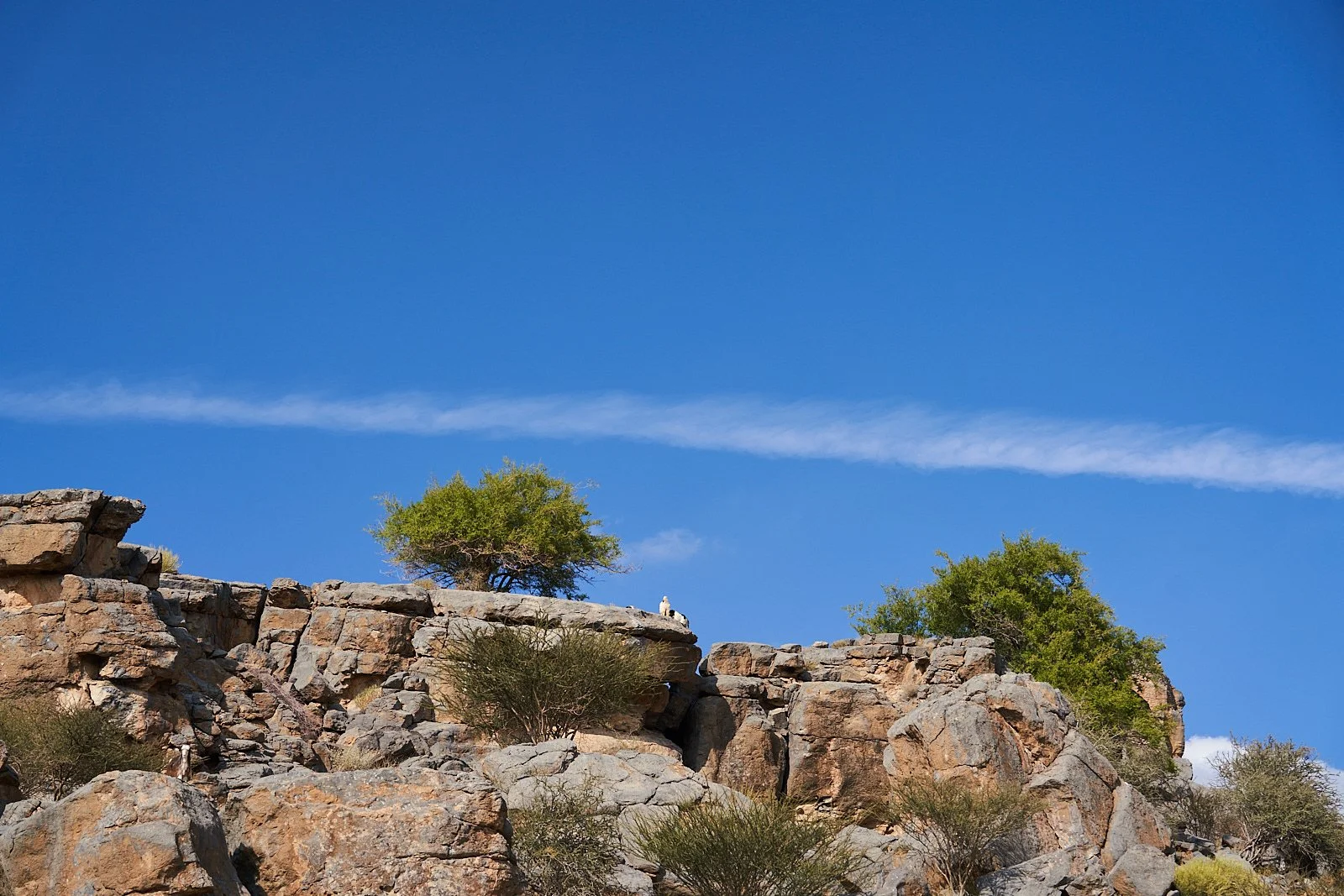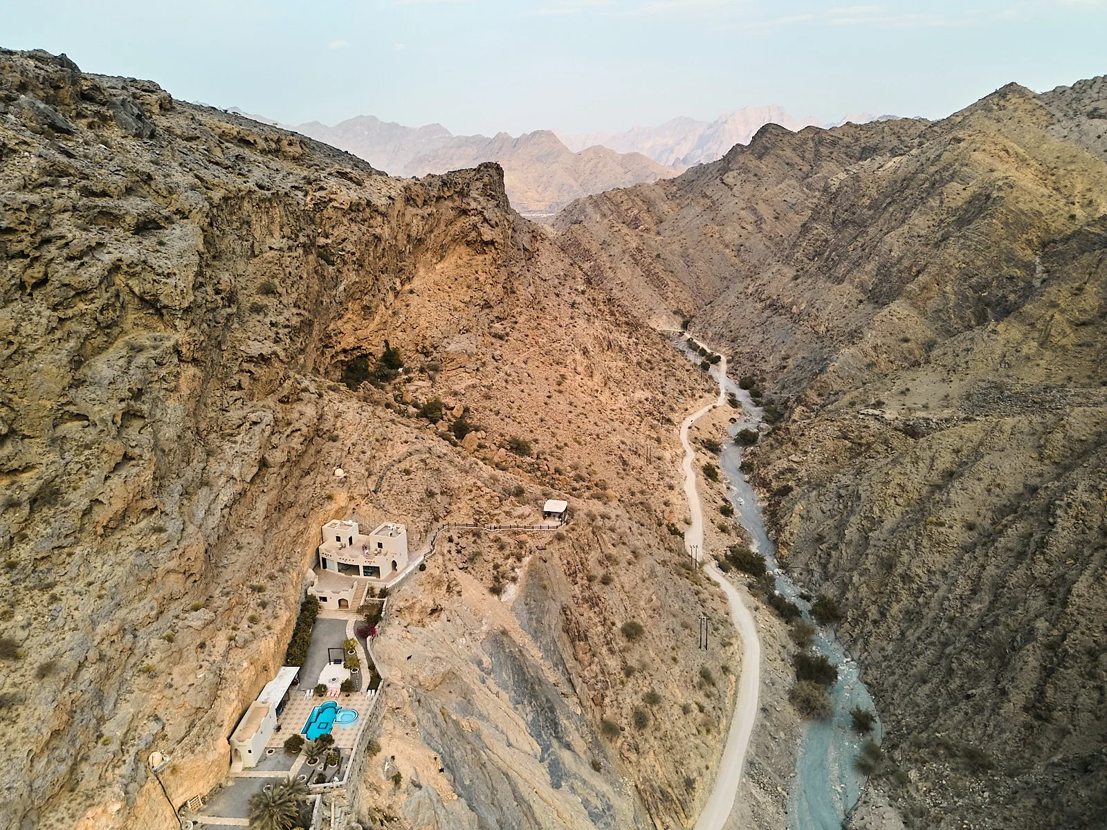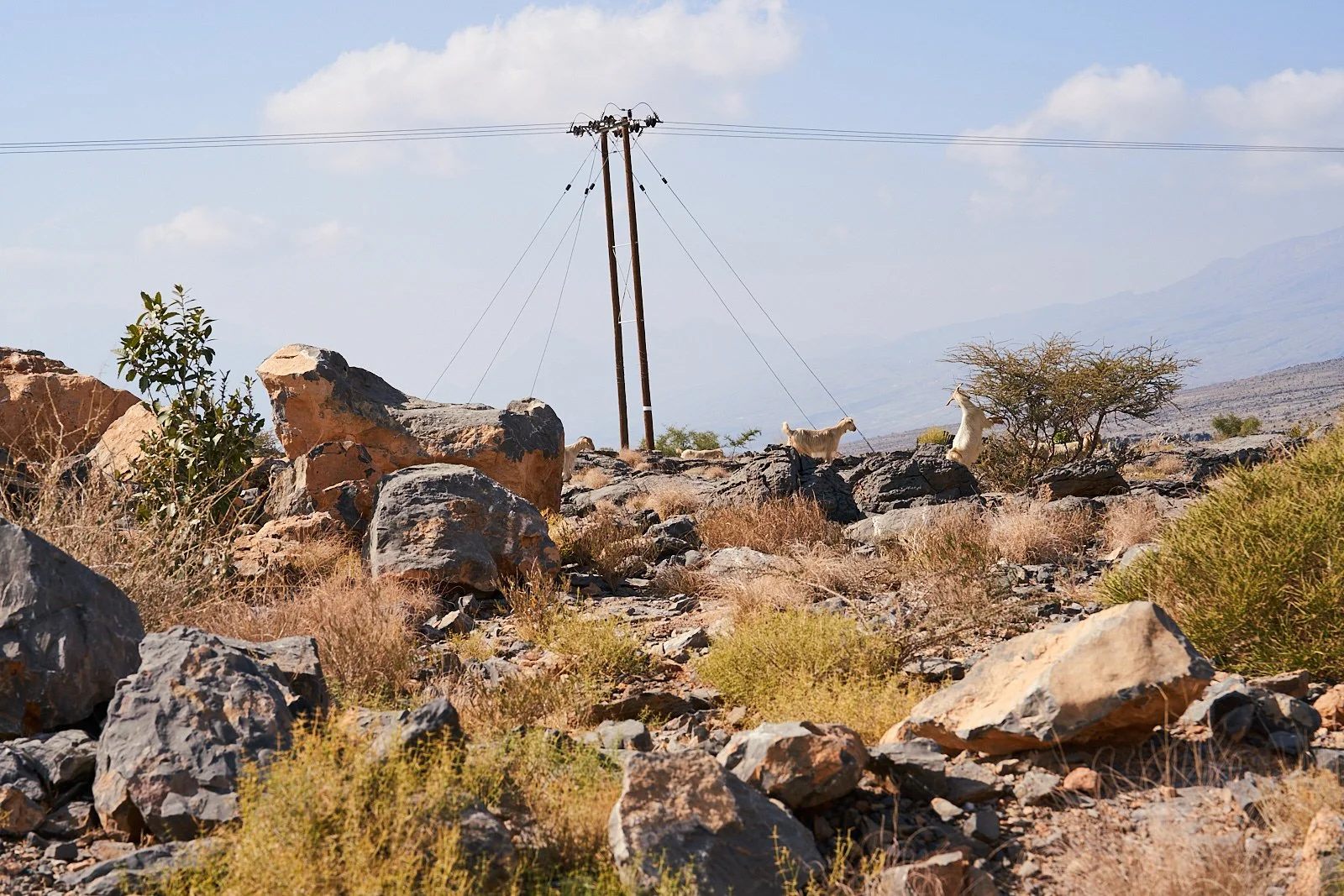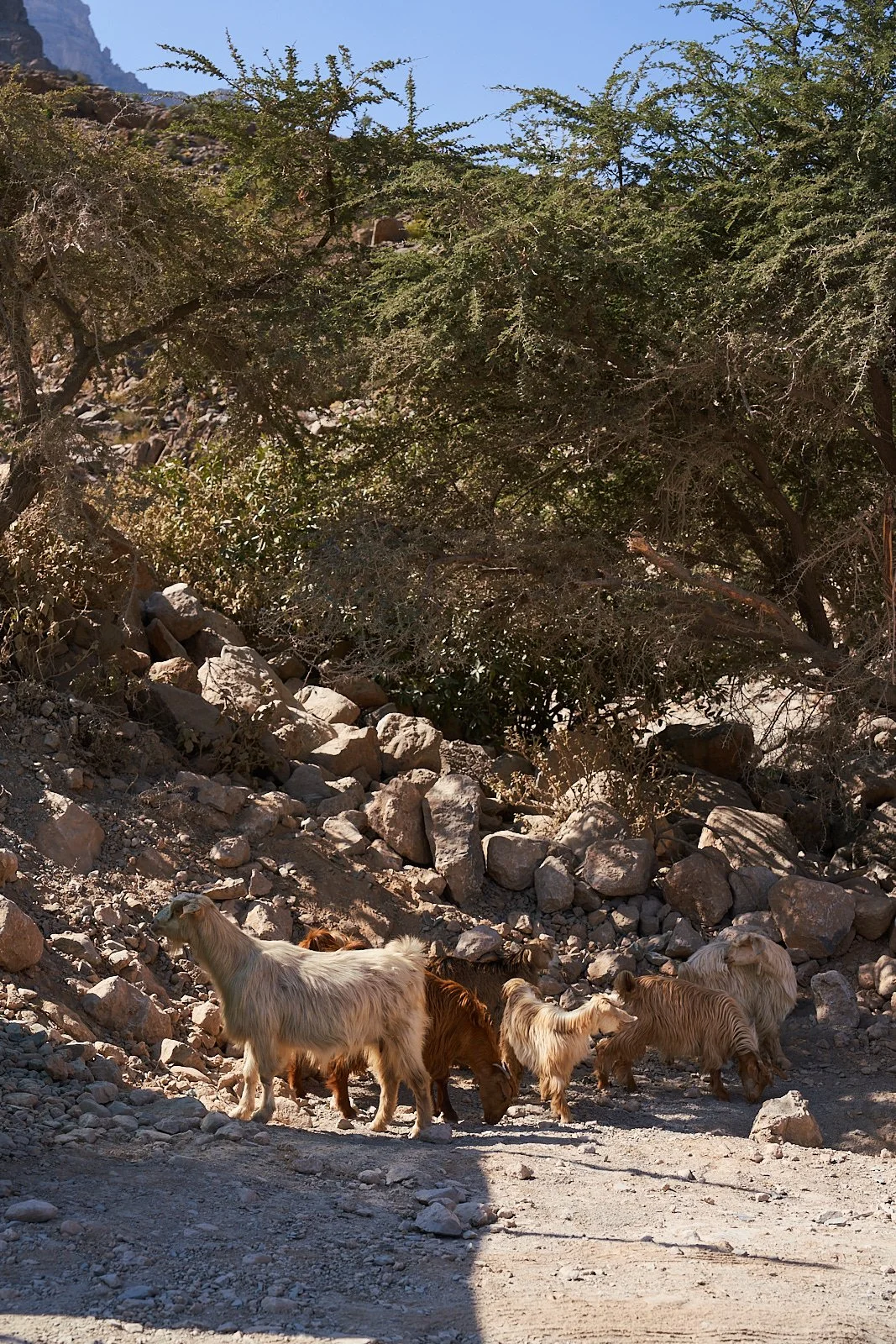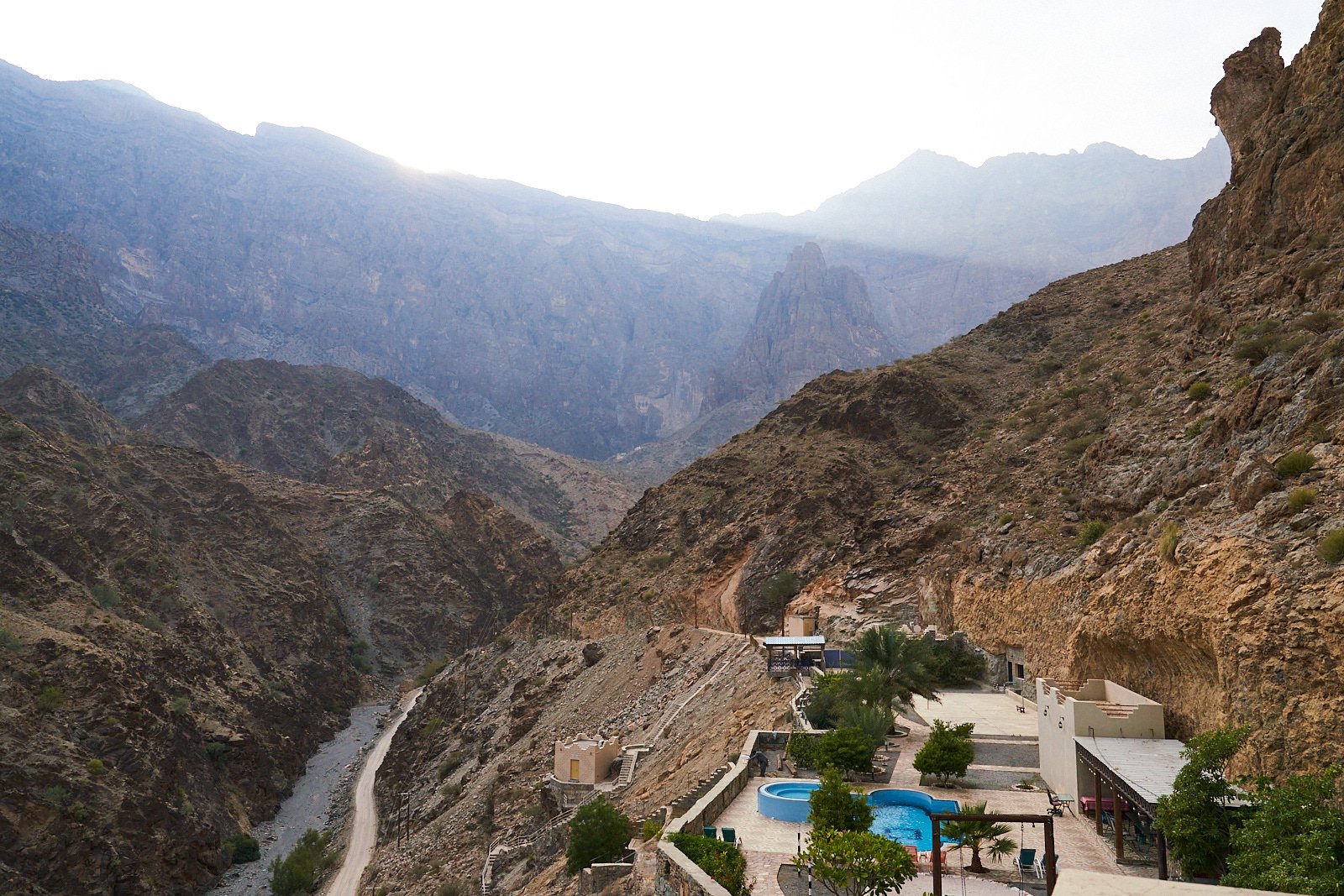 Das Gebirge kann man von Muskat aus über die Schnellstraße durchqueren oder - vorausgesetzt man hat einen Allradantrieb - über die schlängeligen Bergstraßen. Wir fahren von Muladdah über Rustaq zu unserer Unterkunft Tilal Alqtara im Dschabal Schams Gebirge und genießen die Aussicht, den Pool und die Ruhe - wir sind die einzigen Gäste und bekommen ein kostenloses Upgrade! Der Pool ist nachts beheizt und die Ziegen stehen den ganzen Tag verteilt auf den umliegenden Bergen und unterhalten sich unentwegt.
