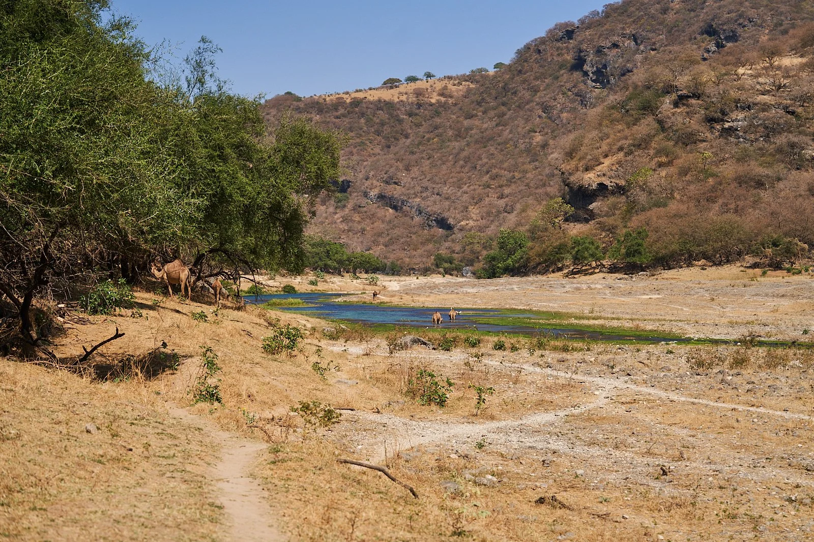 Ganz in der Nähe von unserer Bucht vor Hasik befindet sich ein eingetragener Zeltplatz, den wir uns zu erst anschauen. Von der Straße aus geht es scharf rechts nach unten an einen Flusslauf umsäumt von Palmen. Sieht super aus, ist schattig, bestimmt windgeschützt - aber leider für ein Zelt auf dem Boden zu uneben und ganz schön voll mit Kötteln und (noch schlimmer) voll mit Moskitos.