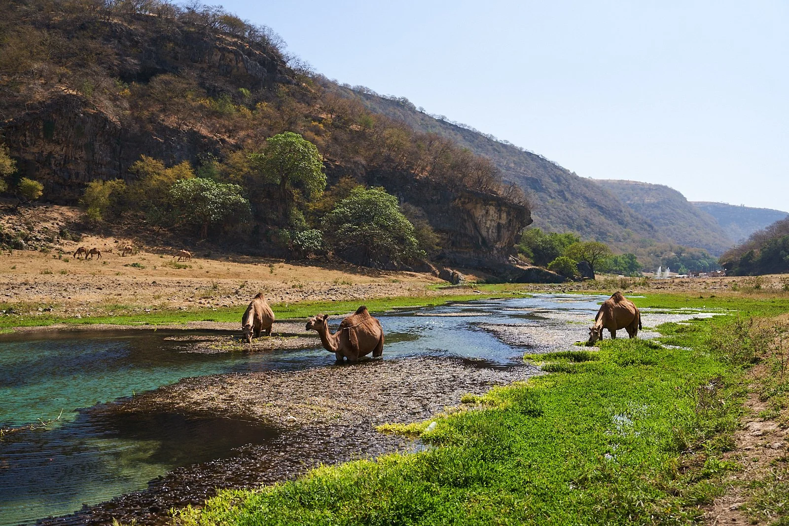 Wir machen uns morgens in Salalah auf den Weg um an der Küste entlang wieder hoch nach Muskat zu fahren. Für den ersten Tag planen wir einen kleinen Ausflug im Wadi Darbat ein. Hier gibts Kamele überall! Und hier gibts dann auch die, die ans Fenster kommen…